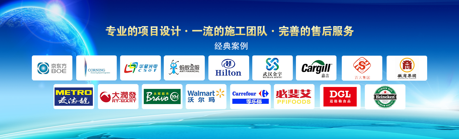 冷凍冷藏設備大型冷庫項目: 武漢中百物流冷庫(40000㎡)、蘇州、北京普洛斯大型物流庫(17000㎡)、沈陽佳德物流冷庫(20000㎡)、上海東航配餐物流庫(6000㎡)、杭州華商勾莊物流冷庫(24000㎡)、安徽安心蔬菜綠色食品冷庫(12000㎡)、武漢金宇冷庫(35000㎡)、必斐艾食品廠(14000㎡)、中國-東盟(百色)農(nóng)產(chǎn)品交易中心冷庫物流工程(30000㎡)、遵鐵物流冷鏈物流區(qū)建設項目中心冷庫物流工程(16500㎡)、長沙云冷產(chǎn)業(yè)園冷庫物流工程(21000㎡)等;大型中央空調(diào)項目: 武漢康寧顯示玻璃廠廠房、武漢京東方模組廠房、武漢華星光電模組廠房、深圳華星光電模組廠房,杭州阿里巴巴辦公樓,舟山波音737機場辦公樓,南京江北能源站、上海金融大酒店等
